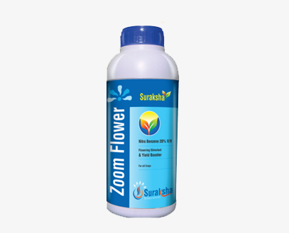 Suraksha Flowerish or Zoom Flower is a research based product containing 20% Nitro Benzene v/v with naturally available vegetable protein. It is a Plant Energizer, Flowering Stimulant and Yield Booster. It enhances the plant canopy and induces professed flowering &thereby increases the yield. It is compatible with Pesticides & Fungicides. For all crops like Cotton, Paddy, Wheat, Soyabean, Chillies, Brinjal, Tomato & other vegetable crops, Pulses, Oil Seeds, Fruits and Flowering crops, spraying once in every 25 days after 15 days of sowing/ trasplantation increases the yield very significantly.
