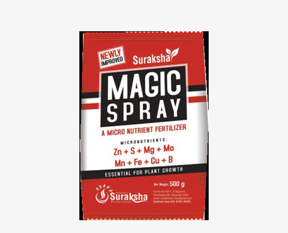 MAGIC SPRAY is EDTA Chelated Micro Nutrient Mixture, free-flowing, fine crystalline green color micro granular powder. MAGIC SPRAY supply required Six Essential micronutrients together in optimum dose to crops, MAGIC SPRAY helps to prevent mix crop deficiencies in different forms occurred gradually at different growth stages of crops. MAGIC SPRAY is chelated with EDTA and thus assures fast absorption of all individual micro elements in to plants.