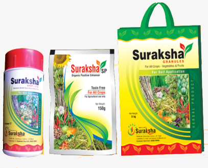 Suraksha is a Biotechnology research product. Suraksha Granules An exclusive, ecofriendly biofertilizer developed under latest biotechnology research based on vegetable and plant origin with hydrolized proteins, Seaweed, enzymes and auxins for maximum and better quality yields.